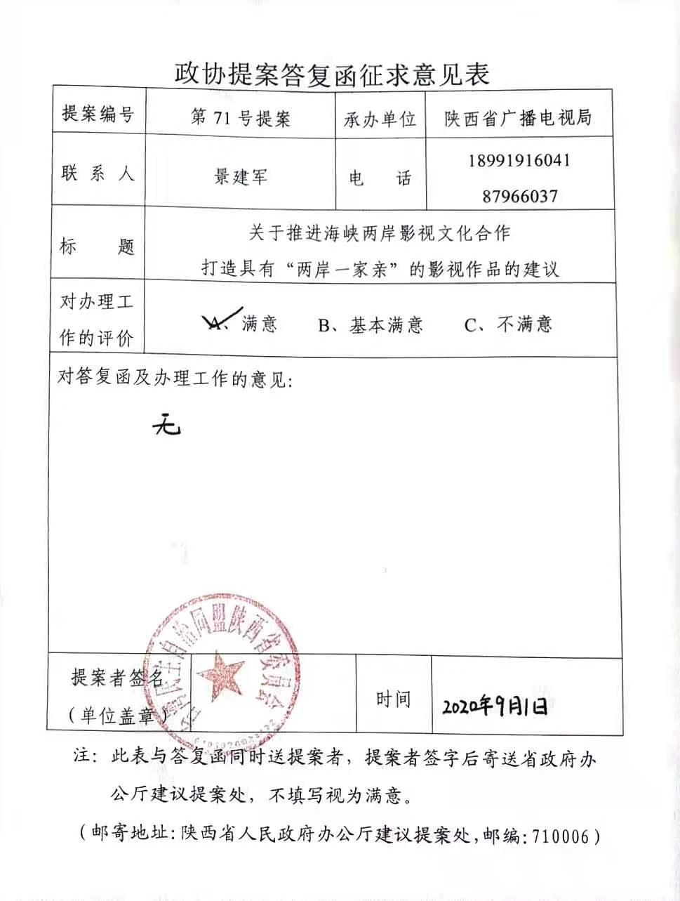 贵党派提出的《关于推进海峡两岸影视文化合作,打造具有“两岸一家亲”的影视精品的建议》(〔2020年〕第71号)收悉。提案中涉及我局的职能和业务,现就有关情况答复如下: